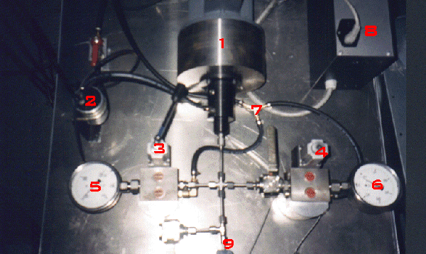 1: Pompe; 2: Filtre et arrivée d'essence; 3: Vis de réglages des hautes pressions; 4: Vis de réglages des basses pressions; 5: Limiteur hautes pressions; 6: Limiteur basses pressions; 7: Arrivée pression; 8: Alimentation pompe; 9: Vers injecteur.